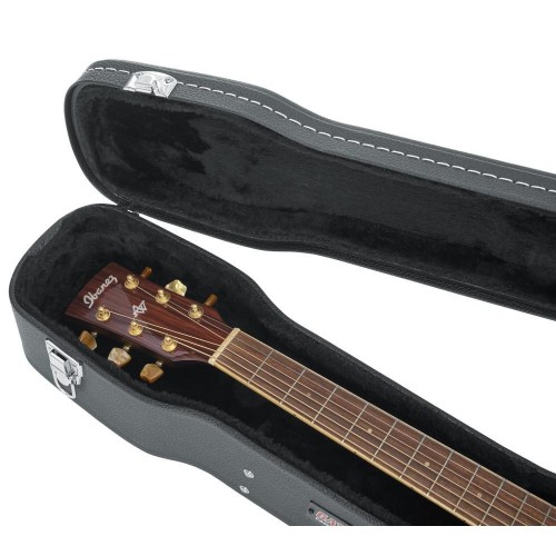 Ez a deluxe fa tok kifejezetten dreadnought gitárokhoz készült, kiemelkedő védelmet és stílust biztosítva. A masszív rétegelt lemez szerkezet tartósságot garantál, míg a plüss bélésű, habpárnázott belső tároló rekesszel biztonságban tartja hangszerét. A tok zárható, és ergonómiailag tervezett párnázott hordozó fogantyúval rendelkezik a könnyű szállítás érdekében. A kontrasztos varrás és a tripla krómozott hardver eleganciát kölcsönöz ennek a kiváló minőségű toknak.