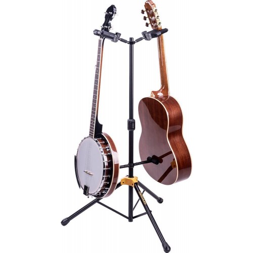 A HERCULES Double Guitar Stand GS422B PLUS két hangszer elhelyezésére alkalmas, és olyan jellemzőkkel rendelkezik, mint a hajtogatható Auto Grip System (AGS) yoke-ok, az azonnali magasságállító kuplung, a különleges Formulated Foam (SFF) párnázott érintkező pontok és az állítható hátsó támaszok.