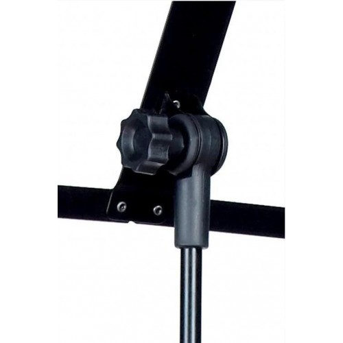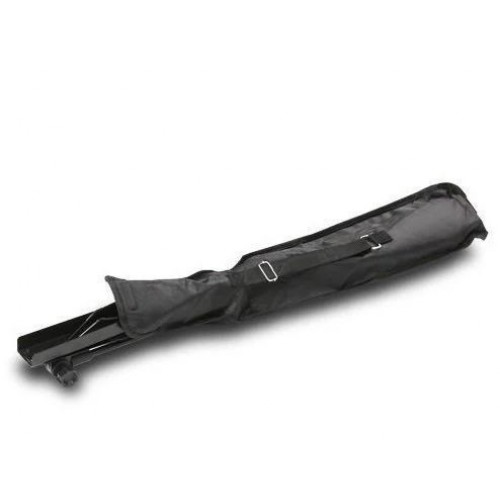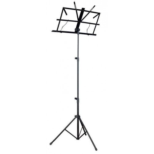 Állítható magasságú, háromrészes kottatartó stabil, 340 mm hosszú lábakkal és kihúzható rúddal. A 490 x 250 mm-es kottalap két papírrögzítővel van ellátva. Fekete színű kivitel, tartós Cordura vállpántos hordtáskával szállítva.