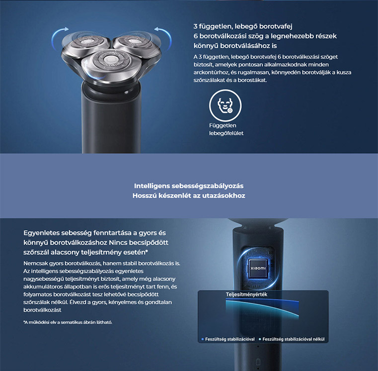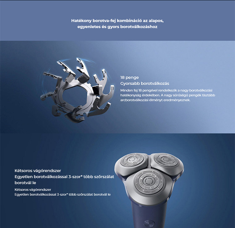 *3 alkalommal: A termék kétsoros vágórendszere összesen 135 szakállszőrzet felvétellel rendelkezik, amelyek közül a külső és a belső sor 90, illetve 45 felvétellel rendelkezik. A belső sort összehasonlításként használva a teljes szakállfelvétel 2 szer nagyobb.