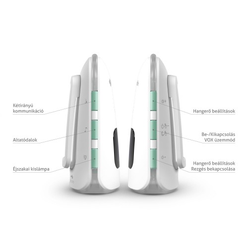 A gyors áttekintés érdekében a szülői egység LCD kijelzővel van felszerelve, valamint jelzi a jelkiesést, az alacsony akku töltöttségi szintet, illetve az alacsony vagy magas szobahőmérsékletet. A digitális jelátvitel biztonságos, így nem kell aggódnia, hogy a jelet lehallgatják. A szülői egység praktikus övcsipesszel övre is rögzíthető. Ha azonban véletlenül leteszi valahol, a gyermeknél lévő egység és a hangkereső segítségével megkeresheti a szülői egységet. A gyermeknél lévő egység akár két szülői egységgel is párosítható.
