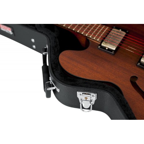 Ez a keményhéjú fa tok a félüreges gitárok, például a Gibson 335® számára készült, és maximális védelmet nyújt. Az ultra-tartós rétegelt lemez szerkezet és a fekete Tolex PVC borítás biztosítja, hogy hangszere biztonságban legyen. Az ergonomikus fogantyú kényelmes fogást nyújt, a vastag plüss bélés pedig párnázza a gitárt az ütések ellen. Emellett a tágas belső tartozéktartó rekesz tökéletesen rendszerezi a gitárkiegészítőket, miközben extra nyaktámaszt is biztosít. A krómozott zárható csatok további biztonságot nyújtanak.