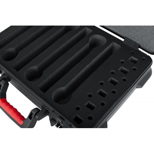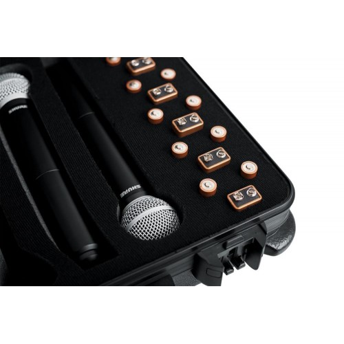 A TSA sorozatú ATA formázott polietilén tokot kifejezetten (6) vezeték nélküli mikrofon habszivacs cseppjeihez tervezték, akkumulátortárolással. Ez a robusztus tok kivételes védelmet és kényelmet biztosít az értékes audiofelszerelés számára.