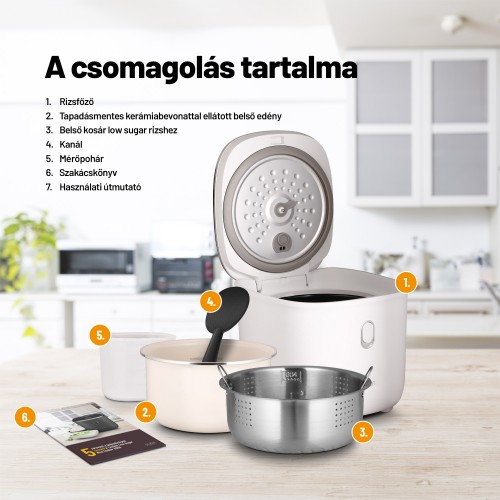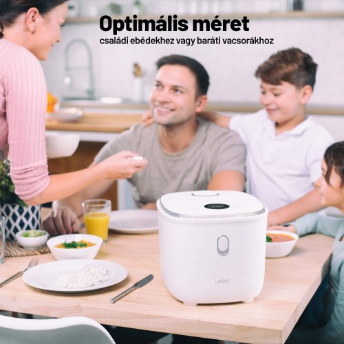 A rizsben lévő szénhidrátok akár 40%-át is eltávolítjaHa egészségesebben szeretne étkezni, a Lauben Low Sugar Rice Cooker 3000WT nem hiányozhat a konyhájából. A low sugar funkció a szénhidrátok akár 40%-át is eltávolítja az ételből. A készülék minden rizstípust, de más alapanyagokat, például hüvelyeseket is képes feldolgozni. 6 mód közül választhat, de ezek manuálisan is beállíthatók. A 3 literes edény prémium tapadásmentes kerámiafelületének köszönhetően az egész család számára anélkül készítheti el az ételeket, hogy zsiradékra lenne szüksége, és aggódnia kellene az odaégés miatt. Örülni fog a Keep Warm funkciónak, amely a szétfőzés veszélye nélkül melegen tartja az ételt, továbbá a késleltetett indításnak vagy a túlfolyás elleni védelemnek, valamint a Cool Touch technológiának, amelynek köszönhetően nem égeti meg a rizsfőző oldala. Az érintőkijelző megkönnyíti a rizsfőző beállítását. Az egyszerű karbantartás magától értetődő, elég behelyezni a belső részeket a mosogatógépbe. Ihletként egy szakácskönyvet is mellékeltünk.