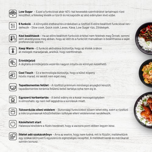 Amellett, hogy bármilyen típusú rizst tökéletesen elkészíthet egyetlen gombnyomással, a rizsfőzőt más ételekhez is használhatja. 6 praktikus előre beállított funkció - Slow cook, Quick cook, Leves, Porridge, Low Sugar Rice, Zöldségek - a hüvelyesek vagy a zabkása elkészítésével is megbirkózik. Ha a beállított értékek nem felelnek meg Önnek, az időt és a funkciót kézzel is beállíthatja. Néha melegen kell tartani az ételt, amit a Keep Warm funkció tesz lehetővé. Kezdeti inspirációként a rizsfőzőhöz mellékeltünk egy szakácskönyvet, amely 5 egészséges és egyszerű receptet tartalmaz.