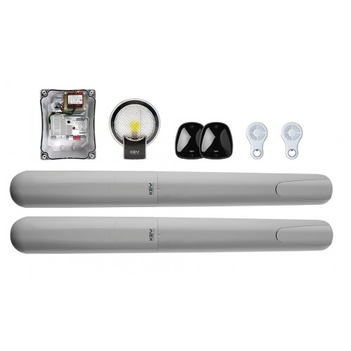 Kétszárnyú kapuk automatizálására szolgáló szett, legfeljebb 3 m hosszú és 500 kg tömegű kapuszárnyakhoz. 24 V DC motorral és CT20324 vezérlőegységgel.