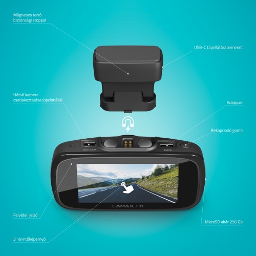 Minden sofőr tudja, milyen stresszes lehet az úton. Ezért mindig legyen valaki, aki a hátát veszi. A LAMAX C11 GPS 4K műszerfal kamera a mezőny élén áll, tökéletes vezetési felvételeket készíthet valós 4K-ban vagy rendkívül finom 2,5K-ban. Ütközés esetén a G-Sensor automatikusan zárolja a felvételt, hogy bizonyítékként lehessen használni; szükség esetén az érintőképernyő segítségével zárolhatja a felvételi fájlt. A felvételek villámgyorsan letölthetők az alkalmazáson keresztül a beépített 5 GHz-es Wi-Fi-nek köszönhetően. A memóriakártya maximum 256 GB-nyi nagy felbontású felvételt tud tárolni, a készülék pedig a H.265 kodek segítségével gondoskodik arról, hogy a tárolt fájlok kevesebb helyet foglaljanak. A rögzítés állítható felvételi időtartamú hurokban történik, a time-lapse funkció pedig különösen hasznos parkoláskor. A mikrofon automatikusan rögzíti a hangot, de természetesen ki is kapcsolhatja, ha akarja. A kamera vezérlése egy felhasználóbarát 3 hüvelykes érintőképernyőn keresztül történik, amely tartalmaz egy sebességmérőt, természetesen magyarul. A tartó 3M mágneses rögzítése matricával pontosan ott tartja a kamerát, ahol szüksége van rá. Ön hivatásos sofőr, vagy egyszerűen csak biztonságban szeretne maradni? A kamera még éjszaka, az autó mögött vagy a belső térben is kiváló minőségű felvételeket készít. Ráadásul a GPS-nek köszönhetően a radar sem fog meglepni, mert a kamera ismeri a helyzetüket. Szeretni fogja a parkolási módot is, amely megvédi az autót a hívatlan látogatóktól. A kamerát egy modern USB-C csatlakozó táplálja, a tápadapternek pedig van egy második portja is, amely támogatja a gyorstöltést a mobiltelefonok újratöltéséhez.