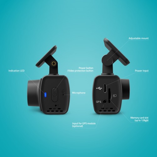 Ügyeltünk rá, hogy a kamera jól nézzen ki a szélvédőjén. A kijelző nélküli kialakítás nem feltűnő és elegáns. A 90×58×36 mm-es kis méreteknek köszönhetően sehol nem lesz útban. Ezenkívül egy átlátszó elektrosztatikus matricát is mellékelünk, hogy a kamera könnyen eltávolítható legyen az üvegről.