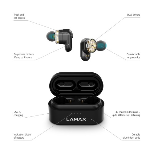Nincs több kompromisszum! LAMAX DualBeat® technológiánk nem nyomja el a frekvenciákat. Éppen ellenkezőleg, megkülönbözteti a két átalakító alacsony, közepes és magas frekvenciáit, amelyeket tökéletes arányban kever hozzá az aktuális számhoz.
