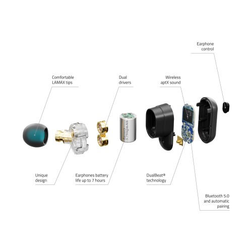Mi a poén a LAMAX DualBeat® technológiát használó duális átalakítóinkban? Mindegyik átalakító a saját hangspektrumáról gondoskodik. A vaskos mélyhangokhoz egyharmaddal könnyebb titánmembránt, a kristálytiszta közép- és magashangokhoz fokozott keménységű membránt használunk. A lejátszási listában szereplő egyes számok frekvenciájának tökéletes arányát az a LAMAX DualBeat® technológia szabályozza, amely a végső mixhez mindkét kimenetet közvetlenül a füledbe továbbítja. Ráadásul a Bluetooth 5.0 adatátviteli sebességét megnövelő aptX kodeknek köszönhetően kiváló vezeték nélküli minőségben.