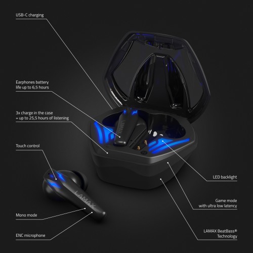 Frissítsd fel gamer felszerelésedet a játékmódnak köszönhetően kiváló hangzást és rendkívül kis késleltetést biztosító LAMAX Heroes Ninja1 vezeték nélküli fülhallgatóval. A minden csatát vagy lejátszási listát valósághűen a füledbe továbbító 8 mm-es hangszóró méretű fülhallgatók LAMAX BeatBass® technológiát használnak. Az üzemidő kérdését is megoldottuk. 6,5 óra egyhuzamban... ez egy remek estének hangzik a virtuális világokban. Ezen kívül a tokban a fülhallgató egykettőre fel is tölt.