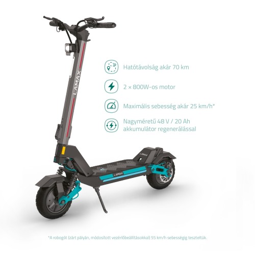 A LAMAX eTank SA70 az Ön rendíthetetlen társa a városi zegzugban és azon túl, az igényesebb terepeken is. Az erő, a stabilitás és a tartósság középpontjában álló, modern ipari formatervezés a részletekre való aprólékos odafigyelést mutatja be. Ez a robogó akár 150 kg-os terhelést is elbír, és kettős 800 W-os motorjaival könnyedén veszi az emelkedőket. A regeneratív fékrendszer hatékonyan tölti fel a nagy kapacitású 48V/20Ah lítium akkumulátort a lejtőkön, az intelligens BMS rendszer pedig optimális védelmet nyújt a túlmelegedés és az alultöltés ellen. Ideális körülmények között akár 70 km-es hatótávolságot kínál, négy választható sebességfokozattal rendelkezik, és 25 km/h-s végsebességet ér el, a sebességet a stabilitással ötvözve páratlan városi ingázási élményt nyújt. Ráadásul két teljesítménymód közül választhat: az öko üzemmód, amely a motor teljesítményének csak 60%-át használja a hatékonyabb vezetés érdekében, vagy a teljes teljesítmény a maximális teljesítmény érdekében.