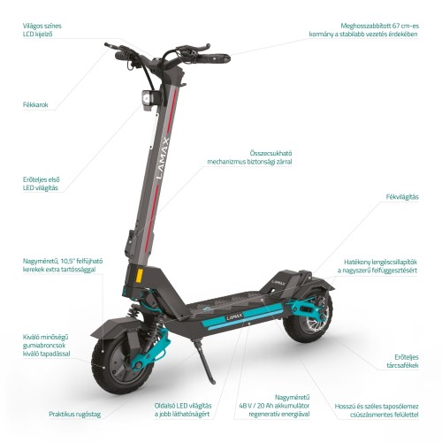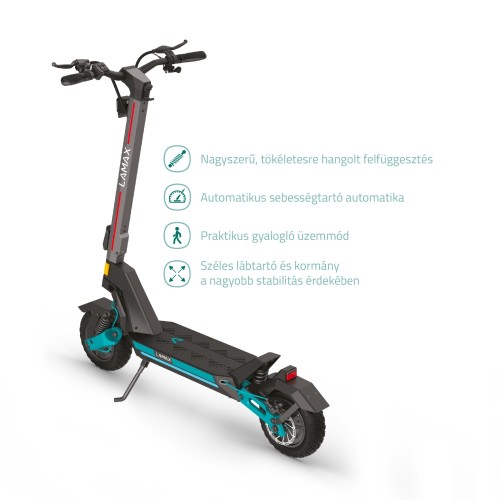 A robogó nagyméretű LCD kijelzője biztosítja, hogy a vezetési adatok bármilyen időjárási körülmények között és éjszaka is tisztán láthatók legyenek, a lopás megelőzése érdekében 3 számjegyű PIN-kóddal követi nyomon a sebességet és az akkumulátor élettartamát. Élvezze a sebességtartó automatika egyszerűségét a könnyed utazásokhoz, és az átfogó LED-világítás, beleértve az első, oldalsó és hátsó lámpákat, biztosítja, hogy minden körülmények között látható legyen. A Séta üzemmód akár 6 km/órás gyengéd tempót kínál, amely ideális a barátokkal való alkalmi sétához vagy a meredek dombok megmászásához lökdösődés nélkül. A roller összecsukása gyors és egyszerű, mindössze 3 másodpercet vesz igénybe 35 kg-os súlya mellett. Bármilyen probléma vagy igény esetén a LAMAX garancia, az értékesítés utáni szolgáltatás és az online alkatrészek mindig a segítségére vannak.