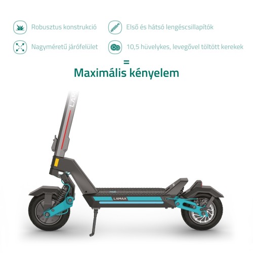A LAMAX eTank SA70 messze nem egy tipikus robogó. Az utazás rendkívül kényelmes a nagyméretű, 10,5 hüvelykes, légtöltésű kerekeknek köszönhetően, amelyeket extra megerősített, defektálló gumiabroncsokkal erősítettek meg. Ezek a kerekek még a legnehezebb felületeken, például macskaköveken is sima utazást biztosítanak, miközben páratlan stabilitást és tapadást nyújtanak fékezés és kanyarodás közben. A robogó menetkomfortját az első és a hátsó felfüggesztési rendszer is új szintre emeli, amelyet egy zajmentes, megerősített hátsó sárvédő egészít ki. A biztonság a legfontosabb, a nem kívánt indítás elleni védelem biztosítja, hogy az elektromos motor csak egy meghatározott sebesség elérésekor kapcsoljon be. A robogó hármas fékrendszerrel büszkélkedhet, amely a kiváló minőségű hátsó és első tárcsafékeket elektronikus fékkel kombinálja, így jelentősen csökkenti a féktávolságot. Az optimális vezetési élmény érdekében a meghosszabbított kormány és a tágas, hosszú fedélzet kivételes stabilitást és biztonságot garantál, így az eTank SA70 mindenki számára ideális választás.