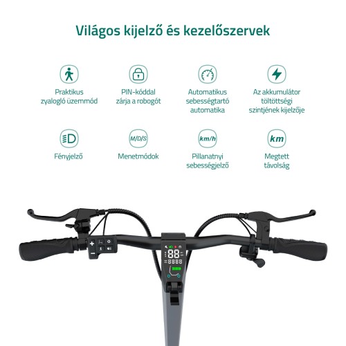 A gyalogló üzemmód tökéletesen alkalmas meredekebb dombokra. Nem kell tolni a robogót, az 6 km/h sebességig húzza Önt - tökéletes a sétáló társak melletti kényelmes utazáshoz.