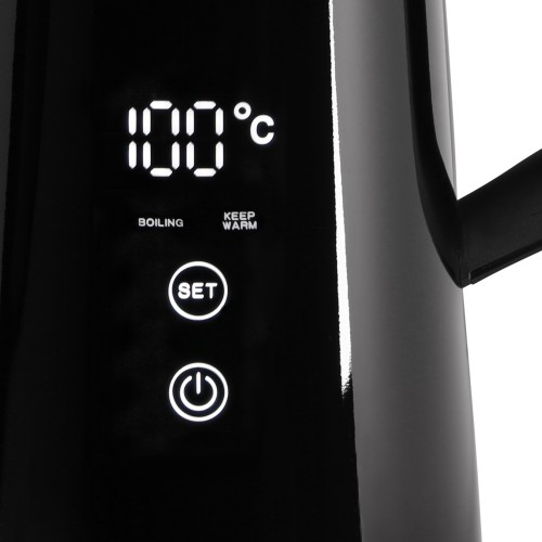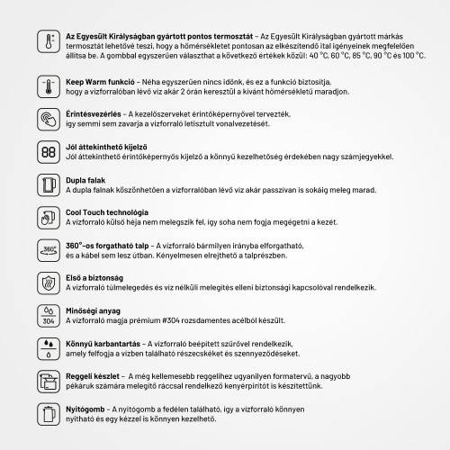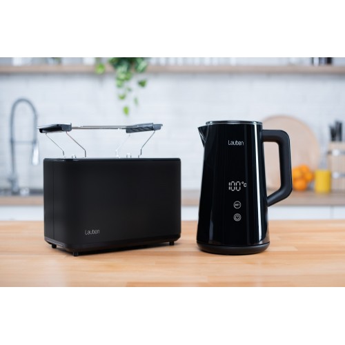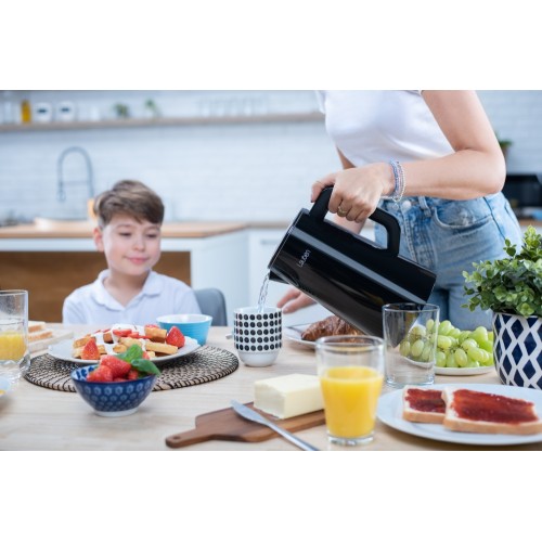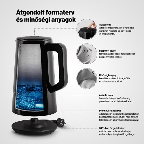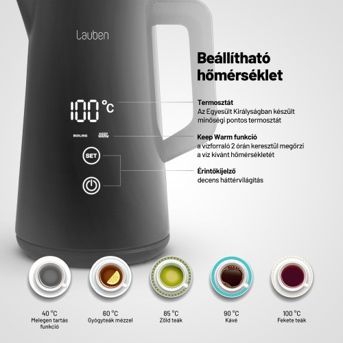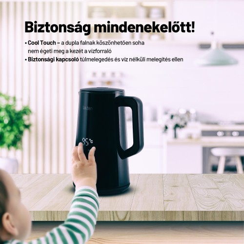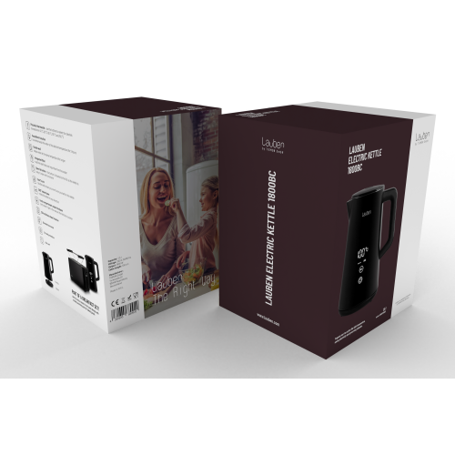 Pontosan az italokra szabott vízAz elektromos vízforraló minden konyha nélkülözhetetlen kelléke. Az is lehet azonban több, mint csak egy újabb hasznos háztartási fogyasztó. A Lauben Electric Kettle 1800BC tökéletes fekete kivitelben, nagy digitális kijelzővel nagyon praktikus, ugyanakkor stílusos dizájn-kiegészítőként is funkcionál. Pontosan a kívánt hőmérsékletre melegíti fel a vizet, és a pontos termosztátnak, valamint a Keep Warm funkciónak köszönhetően akár 2 órán keresztül ugyanazon a hőmérsékleten tartja. A dupla falak azonban még így sem engedik, hogy gyorsan lehűljön. Miután a beépített szűrő számos szennyeződést felfog, a vízforraló karbantartása egyszerűbb. Mint mindig, most is gondolunk a biztonságra, ezért a Cool Touch technológia megakadályozza, hogy megégesse magát a vízforralón, a biztonsági zár pedig megóvja a készüléket a túlmelegedéstől és a víz nélküli forralástól. Természetesen a talprész 360°-ban forgatható, és van hely a kábel elrejtésére is.