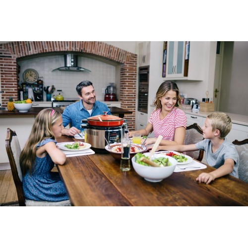 A multicookerben a lehető legegészségesebb módon, azaz a csomagban található speciális gőzölőnek köszönhetően zsírok nélkül, gőzben főzhet. Az ételkészítés egyúttal rendkívül biztonságos, csak használja a mellékelt szilikon védőkesztyűt és szilikon alátétet. Hogy a fazék valóban tartós legyen, többrétegű zománcozott felülettel rendelkezik, amely megakadályozza a rozsdásodást. A főzés ezzel a segítővel gyerekjáték, de ha eleinte hiányozna az ihlet, a mellékelt szakácskönyvben számos könnyű és egészséges receptet talál.