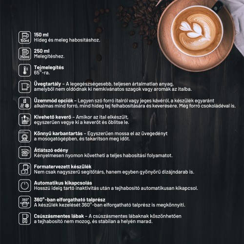 Kedvenc italát akár a kora reggeli órákban vagy akár az irodában is élvezheti anélkül, hogy ezzel bárkit zavarna, mivel a habosító működése rendkívül halk.