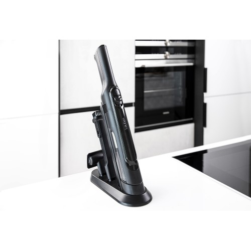 A prémium formatervű, fekete matt felületű, fényes elemekkel ellátott kézi porszívó praktikus USB-C töltős töltőállvánnyal rendelkezik, így mindig használatra kész, és nem foglal túl sok helyet. A mosható szűrőknek köszönhetően kíméli a pénztárcáját, mivel nincs szükség azok állandó cserére. A nyél tetején található gyűjtőtartály karbantartása is nagyon egyszerű és higiénikus, elég mindössze kivenni és kiüríteni.