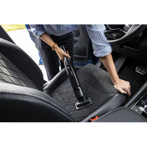 A kézi porszívó prémium matt fekete kivitelű, fényes elemekkel, továbbá könnyített szerkezeti kialakítással és felülre szerelt gyűjtőtartállyal büszkélkedhet, amely így nem akadályozza a szűk helyek kitakarítását.
