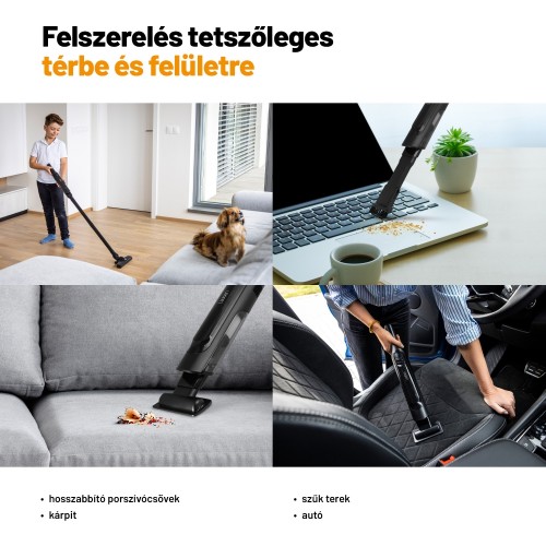 A csomagot kiegészítettük egy szűk helyekre szánt szívófejjel, valamint hosszabbító szívócsövekkel, így például az autóülések között és alatt is nagyon könnyen porszívózhat.