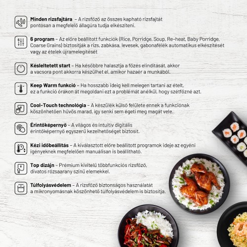 Főzzön könnyedén, ízlésesen és stílusosanA hatékonyság, a könnyű használat és a dizájn közös nevezője a multifunkciós Lauben Multifunction Rice Cooker 1200WR Rose Gold Edition. Egyetlen gombnyomással bármilyen rizsfajtát a megfelelő keménységűre főz, a 6 előre beállított funkcióval pedig más ételek, például zabkása vagy levesek varázsolhatók elő. Egyes programok időtartama azonban manuálisan is beállítható az intuitív érintőképernyőn. A késleltetett indítás funkciónak köszönhetően az ételek már a hazaérkezésekor készek lehetnek, a késve érkezők értékelni fogják a Melegen tartás funkciót, amely szétfőzés nélkül tartja melegen az ételt. Az adagokkal mind az egyének, mind a párok jól laknak, akiknek így több idejük marad magukra, miután a karbantartás sem vesz igénybe sok időt. A belső edény mosogatógépben is elmosható. A túlfolyásvédelem és a Cool Touch megégésgátló technológia garantálja a biztonságos használatot. A rizsfőző bármelyik konyha dísze lehet, amelyet a divatos rózsaarany szín feldob, miközben maga a készülék alig foglal helyet.