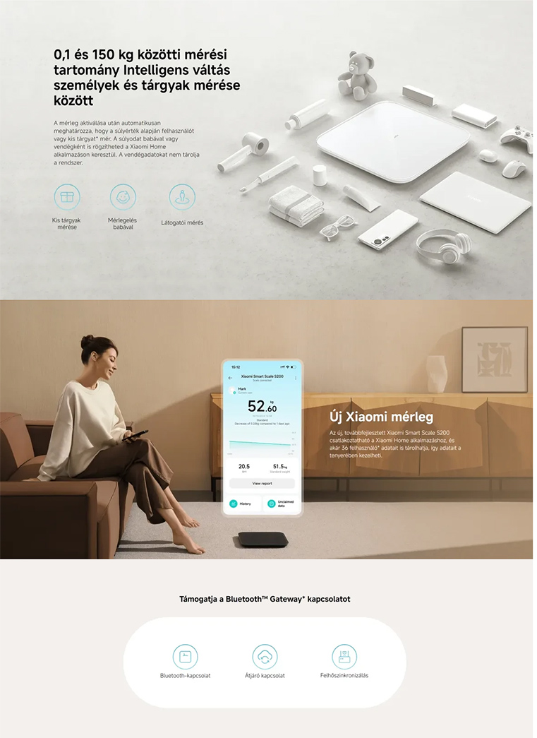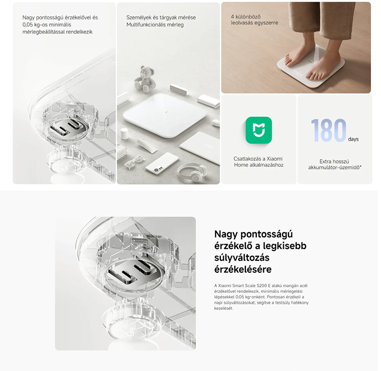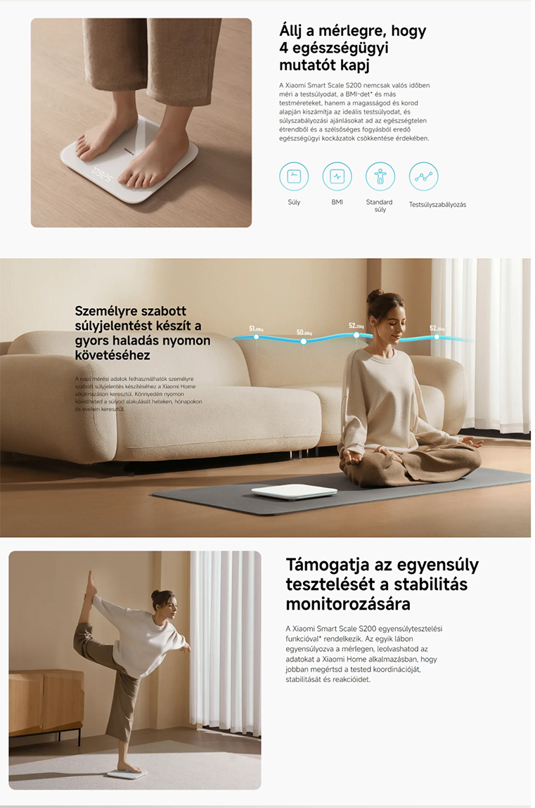 A Xiaomi Smart Scale S200 egy okosmérleg, amely a testsúly pontos mérésére készült, kiegészítve digitális funkciókkal és alkalmazásos adatkövetéssel. Minimalista, fehér kivitelű eszköz edzett üveg felülettel.
