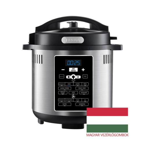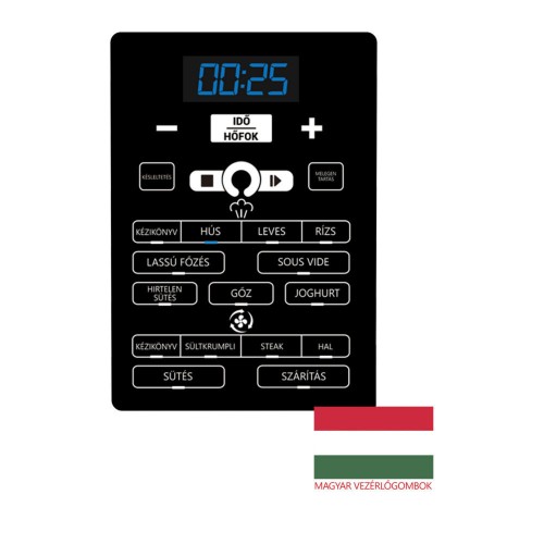 Az átlátszó digitális kijelző kék háttérvilágítással és magyar nyelvű gombokkal megkönnyíti a főzési program gyors beállítását. A kiválasztott program automatikusan fenntartja a megfelelő hőmérsékletet főzés közben, szabályozza a nyomást és a kijelzőn megjelenik a hátralévő főzési idő. A program után az ételeket a tálalásig melegen tartja.