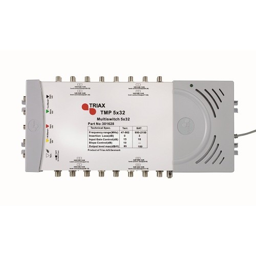 A Triax TMS/CKR 5×32 S egy nagy kapacitású, aktív multiswitch, amely egy műholdas pozíció (4 polarizáció) és egy földi antenna (DVB-T/T2/FM/DAB) jelét osztja szét akár 32 előfizetői kimenetre.