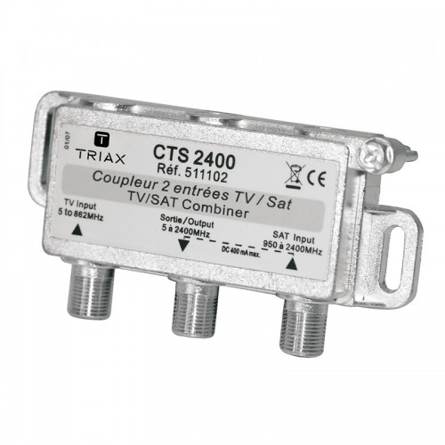 A TRIAX CTS 2400 egy TV/SAT jelösszegző szűrő, amely lehetővé teszi a földi (TV) és műholdas (SAT) jelek egyidejű átvitelét egyetlen koaxiális kábelen. A jelátviteli sávokat precízen szűri és választja szét, így kiváló minőségű jeltovábbítást biztosít. Masszív, öntött fémház védi a külső zavaroktól, és biztosítja a hosszú élettartamot. Minden csatlakozó egy oldalon helyezkedik el a gyors és helytakarékos telepítés érdekében.