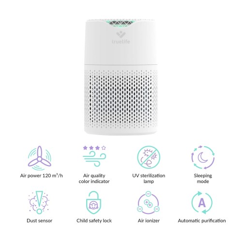 A TrueLife légtisztító óránként 120 m3 levegőt tisztít meg. 12-18 m2 alapterületű helyiségekbe alkalmas, kis súlyának köszönhetően gond nélkül hordozható. A tisztító általában javítja a levegő minőségét, elpusztítja a vírusokat, baktériumokat és egyéb szennyeződéseket, valamint jelentősen segíthet az allergiásokon vagy asztmásokon. A légtisztító színes levegőminőség-kijelzőkkel, automatikus légszennyezés-detektálás, valamint automatikus tisztítás funkcióval rendelkezik. Ha fokozottan poros a környezete, minden bizonnyal örülni fog a porérzékelőnek. Az antibakteriális szűrő, HEPA-szűrő, szénszűrő, katalitikus szűrő, UV-fény és ionizálás képezte hatszoros szűrésnek köszönhetően a készülék befogja a levegőben szálló por akár 99,9%-át, valamint megtisztítja azt az illékony szerves vegyületek akár 93,5% -ától. Vírusokat és koronavírusokat is szűri.