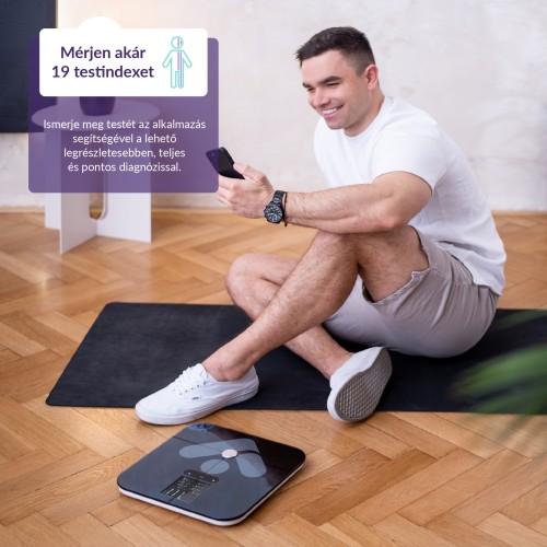 A FitScale W7 BT intelligens mérleggel nem csak a súlyát tarthatja szemmel. A 19 testindex mérésével sokkal jobban megértheti a test működését. Azonnal láthatja a zsírszövet arányát vagy a szervezet működéséhez szükséges energia mennyiségét. A mobilalkalmazás megmutatja, hogyan változik teste összetétele, mennyi vizet, zsírt vagy csonttömeget tartalmaz. A teljes diagnózist saját maga végzi el otthonában.