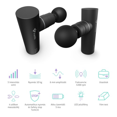 Sportolás és ülőmunka esetén az izmok fájdalmát és merevségét enyhítő kellemes masszázs néha mindenki számára hasznos. De nem mindig van lehetőség masszőrhöz menni, ezért a TrueLife elhozza őt az Ön otthonába. A RelaxGun G6 Metal masszázspisztoly mindig készen áll arra, hogy gondoskodjon Önről. Az 5 fokozat segít regenerálni az izmokat, oldja a feszültséget, javítja a vérkeringést és enyhíti a stresszt. Kis méretei miatt a pisztoly szinte semmit sem nyom, így könnyen kezelhető, ugyanakkor nagy teljesítményt - 10 kg nyomóerőt kínál. Az amplitúdó 6 mm, és a készülék percenként 3200 rezgést végez. 4 cserélhető szilikonfej, valamint praktikus Automatic pressure és Safety stop biztonsági funkciók állnak rendelkezésre. A masszázspisztoly nagyon halkan működik, újratölthető lítium akkumulátorának az üzemideje pedig akár 5 óra is lehet. Az alumínium készülékház nem csak jól néz ki, de ami a legfontosabb, tartós is. A masszázst útközben is élvezheti, csak vigye magával a pisztolyt a mellékelt utazótokban.