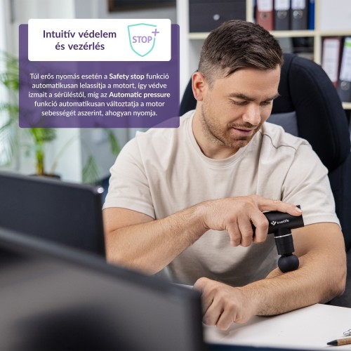A masszázspisztoly erős lenyomása esetén a Safety stop funkció automatikusan lelassítja a motort, és megelőzi így az esetleges sérüléseket.