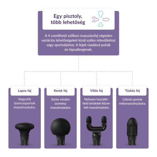 A RelaxGun G6 Metal 4 db a test különböző részeire szánt és széles körű felhasználásra tervezett cserélhető szilikonfejet kínál. A puha, szilikon és hipoallergén kialakítás a hagyományos műanyaghoz képest bőrbarát, tartós és könnyen karbantartható. Nagyobb izomcsoportok masszírozására a Flat Head fej alkalmas, mivel nyomása finomabb, amit például a csontok közelében fog értékelni. Az olyan nehezen elérhető területek masszírozására, mint a trapézizom vagy az Achilles-ín, a test körvonalaihoz könnyen alkalmazkodó Fork Head fej a legalkalmasabb. Gyakorlatilag minden izomterület masszírozására alkalmas a testhez tökéletesen alkalmazkodó kerek Ball Head fej. A Bullet Head-et a test meghatározott pontjai, az úgynevezett triggerpontok célzott masszírozására tervezték.