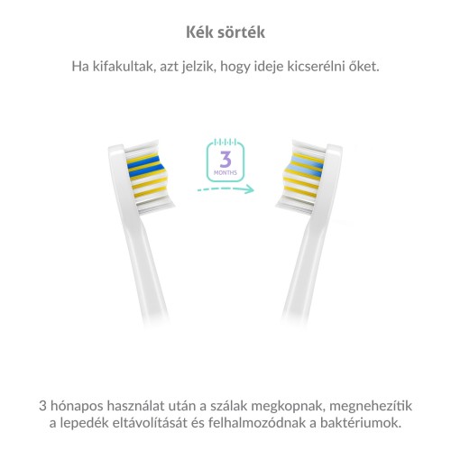 A SonicBrush Compact Pink készülék teljes körű foghigiéniát biztosít. A csomag 3 db különböző típusú cserefejet tartalmaz - Standard a normál fogmosáshoz, Sensitive az érzékenyebb fogakhoz és Whiten a fehérítő hatáshoz. A fejek legfeljebb 3 hónapos használatra alkalmasak, ezt követően a sörtéik meggyengülnek és elhajolnak, veszítenek hatékonyságukból és baktériumok halmozódnak fel közöttük. Szerencsére a fejek kék sörtékkel vannak ellátva, amelyek 3 hónap után kifakulnak, így Ön tudja, hogy itt fejcsere ideje.