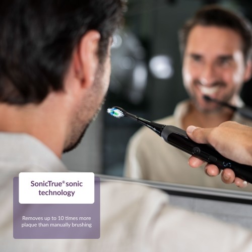 A SonicTrue® szónikus technológia gyengéd rezgéseken alapul, amelyek során a fogkefe sörtéi nagy sebességgel oszcillálnak, és hatékonyan eltávolítják a lepedéket. A percenként 80 000 mozdulat eljuttatja a fogkrémes vizet a fogak közé, és a gyengéd rezgések esélyt sem adnak a lepedéknek, foltoknak vagy baktériumoknak. A szónikus technológia a kézi fogmosásnál és a forgó fogkefe fejeknél jobban kíméli a fogzománcot.