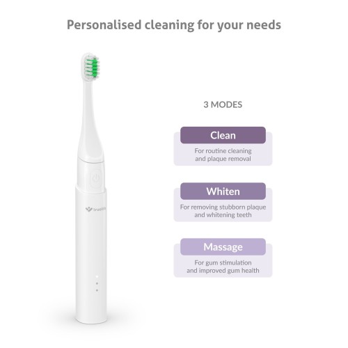 A fogkefe a száj átfogó ápolása érdekében 3 különböző fogmosási módot kínál (Clean, Whiten, Massage).