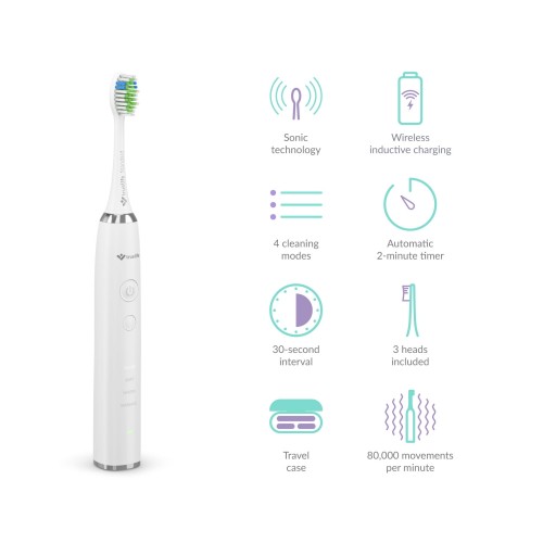 A SonicBrush UV szónikus fogkefe tökéletesen gondoskodik a fogairól. A SonicTrue® nagyfrekvenciás szónikus technológia segítségével a fogkefe sörtéi nagy sebességgel, percenként akár 80 000 mozdulattal oszcillálnak, minden egyes mozdulattal maximális mennyiségű lepedéket távolítva el a zománcról és az ínyről. A szónikus fogkefe sokkal kíméletesebb a fogzománchoz, mint a forgó fogkefék. Ragyogó mosolya ápolásának egyszerűbbé tételéhez most 4 tisztítási mód érhető el. A minőségi akkunak köszönhetően a fogkefe üzemideje egy feltöltéssel akár 19 nap, a mellékelt UV sterilizátor pedig eltávolítja a fejről a baktériumok 99,9%-át. A csomagolás egy szónikus fogkefét, egy UV sterilizátoros dokkoló állomást, három cserefejet (Sensitive, Standard, Whiten) és egy utazótokot tartalmaz.