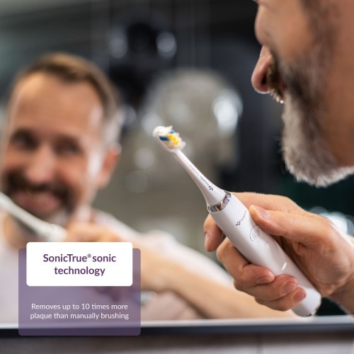 A SonicTrue® szónikus technológia finom rezgéseken alapul, amelyek során a szónikus fogkefe sörtéi nagy sebességgel oszcillálnak, és tökéletesen fellazítják, majd eltávolítják a lepedéket. A páratlan eredmények érdekében a percenkénti 80 000 mozgás továbbá bejuttatja a vizet és a fogkrémet a fogközökbe.