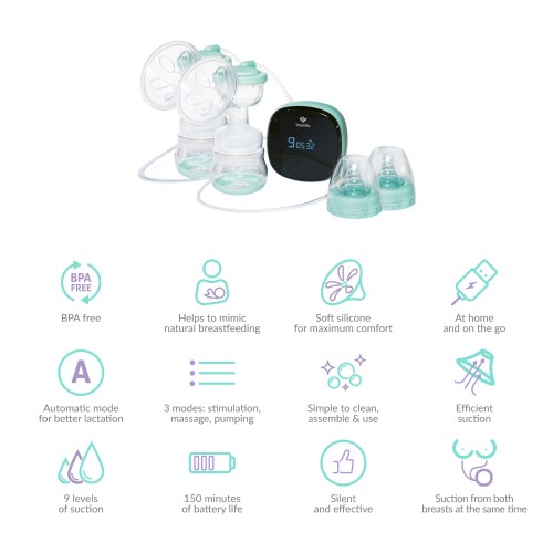 A Nutrio BP Electric Double dupla mellszívó, amely a két mellből egyszerre feji a tejet, a hagyományos mellszívóknál gyorsabban segít megoldani az anyatej hiánya vagy feleslege okozta gondokat. Rendszeres használat esetén is kedvezőbb, akár egészségügyi, akár időbeli okokból van szükség a tej fejésére. Ezenkívül a dupla mellszívó átlagosan 18%-kal több tejet fej le, mintha a két mellből külön-külön fejnénk. A kutatások szerint a két mell egyidejű fejéséből származó tejnek magasabb a zsír- és kalóriatartalma. A MilkFlowStimulation® technológiának köszönhetően a Nutrio BP Electric Double olyan anyák számára is alkalmas, akiknek problémái vannak a szoptatással vagy általában a tejképződéssel. Ugyanakkor olyan helyzetekben is segíthet, amikor a baba nem akar a mellből szopni. A mellszívó vezérlésére és a fejési folyamat ellenőrzésére egy intuitív, több érintőkapcsolóval és időzítővel ellátott kijelző szolgál. Három üzemmód esetében kilenc fokozat közül választhat, így könnyen beállíthatja a szívás legkellemesebb intenzitását.