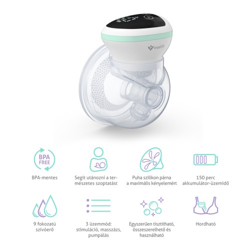 A TrueLife Nutrio BP W5 elektromos mellszívó az anya és a gyermek kényelmét is javítja, mivel úgy tervezték, hogy otthon és útközben is fokozza a szoptatás élményét. Ez a készülék három különböző üzemmóddal támogatja a szoptatási igényeket: a mellmirigyek stimulálása a szoptatás és a tejáramlás fokozása érdekében, masszázsbeállítás a mellek megnyugtatására, valamint a baba természetes szopási ritmusát jól utánzó kifejező üzemmód. Mindegyik üzemmód 9 állítható intenzitási szinttel rendelkezik az egyéni kényelmi preferenciáknak megfelelően. Ideális a szoptatási kihívásokkal küzdő anyák számára, ez az elektromos pumpa automatizálja a folyamatot, hogy megkönnyítse a tejtermelést. Kompakt, elemmel működő készülék, így könnyen szállítható és bárhol használható. A további kényelem érdekében fontolja meg a TrueLife Nutrio melltartóval való párosítását, amely lehetővé teszi a pumpa egyszerű behelyezését, így kéz nélkül is használható. A puha szilikonból és BPA-mentes műanyagból készült pumpa ergonomikus kialakítása kényelmes illeszkedést biztosít a mellhez, miközben a tej hatékonyan összegyűlik egy 210 ml-es tartályba a későbbi felhasználás érdekében. A felhasználóbarát LED-kijelző egyértelmű tájékoztatást nyújt az üzemmódokról és beállításokról, praktikus időzítővel és egyszerű kezelőszervekkel kiegészítve.