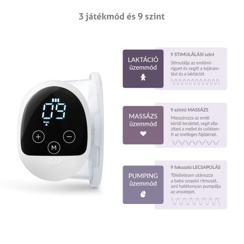 A TrueLife Nutrio BP W5 mellszívót úgy tervezték, hogy hatékonyan kezelje mind az elégtelen, mind a túlzott tejtermelést. 3 testre szabott üzemmóddal rendelkezik, amelyek mindegyike 9 intenzitási szinten állítható a kényelem és az optimális teljesítmény biztosítása érdekében. A stimulációs üzemmód az emlőmirigyek aktiválásával fokozza a szoptatást, így felbecsülhetetlen értékű azoknak, akiknek alacsony a tejtermelésük, ugyanakkor bőséges tejtermelés esetén segíti a tejáramlás megkönnyítését. A masszázs üzemmód gyengéden ápolja az areolát, megnyugtatja a melleket és enyhíti az esetleges kellemetlenségeket. A tejkifejtő üzemmód jelentős megkönnyebbülést nyújt a tej hatékony pumpálásával, a baba természetes szoptatási ritmusának pontos utánzásával.