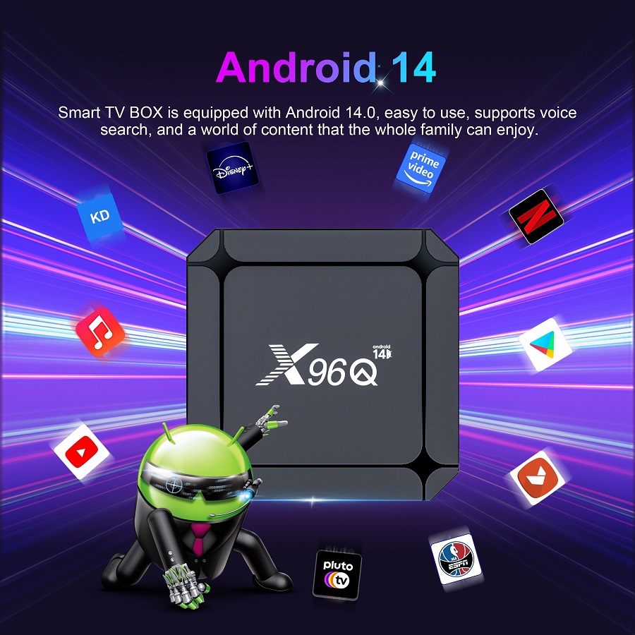 Az X96Q egy Android 14 operációs rendszerrel működő Internetes Multimédia streaming Set Top Box, média lejátszó. Szabványos Android operációs rendszerrel működik, ugyanaz a menüje mint a többi megszokott Android boxnak vagy TV nek. A készülék elég gyors támogatja a 2,4Ghz vagy 5Ghz Wifit akár WIFI6 szabványban is. A HDMI csatlakozás 2.0 ami a 4K felbontás lejátszásához ajánlott. Az 1.4 Ver HDMI Kábellel is működik de inkább csak 1080P módban. A Netflix gyári telepített aplikáció frissít az internetről, rákérdez a telepítéshez. A Google Play belépés működik, de vannak kivételek, jelenleg nem letölthető a Disney aplikáció.