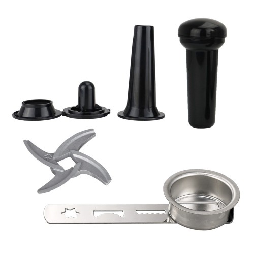 A géphez olyan tartozékok tartoznak, amelyek még több lehetőséget biztosítanak Önnek: vágódeszka a hús normál és durva darálásához (5 mm és 8 mm), fém négyzetes tálca az élelmiszerek számára, egy toldat kolbászokhoz és kibbehhez, valamint egy ételnyomó. segít kinyomni minden húsdarabot.